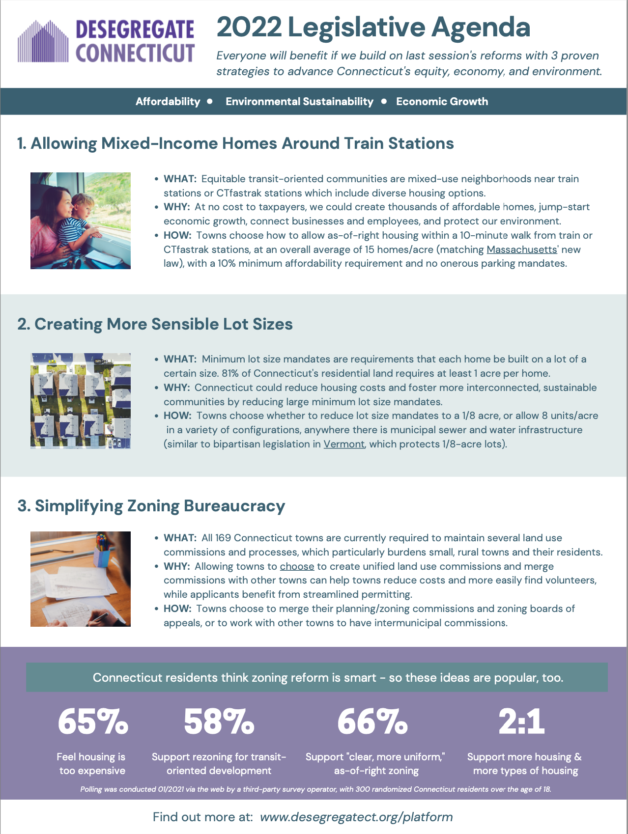 Everyone will benefit from a more equitable, economically strong, and cleaner Connecticut if we ensure our land use laws are more inclusive by design. Building on Public Act 21-29, we’re supporting the following 3 proposals for the 2022 short legislative session, and we have one bill being heard by the Legislature (HB 5429)! Let’s do this!